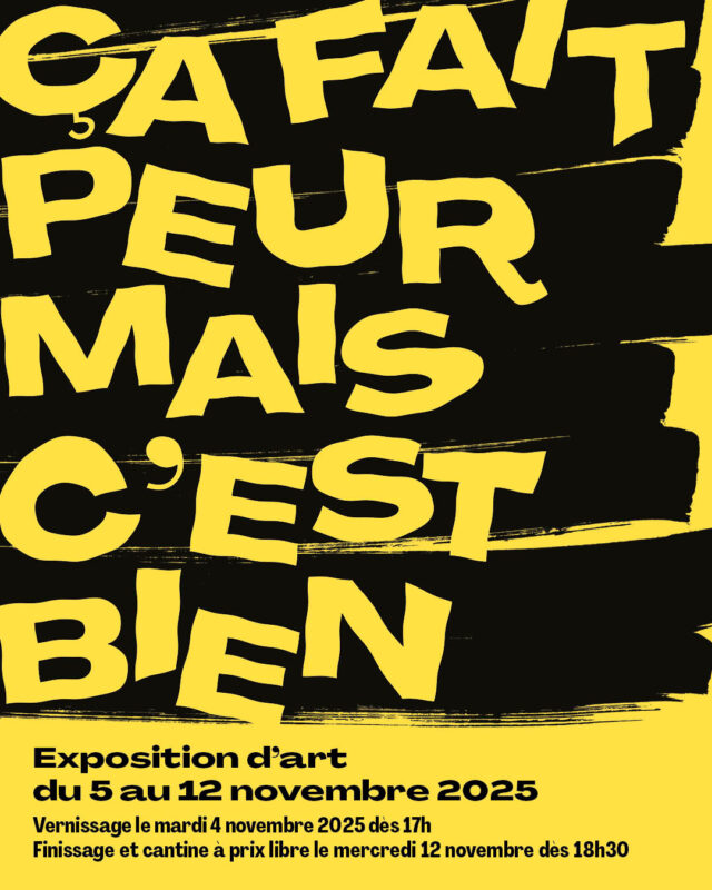 Exposition – « Ça fait peur mais c’est bien »Ancienne Poste des Charmilles, GenèveDu 5 au 12 novembre 2025 Save the datesVernissage le mardi 4 novembre dès 17hFinissage le mercredi 12 novembre...