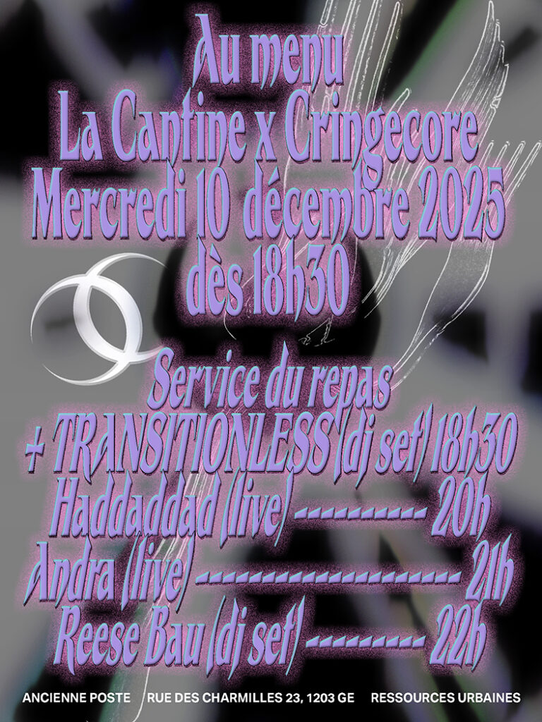 Mercredi 10 décembre, on se donne rendez-vous dès 18:30 à la Cantine de l’Ancienne Poste pour un repas prix libre et une programmation musicale par Cringecore ♡