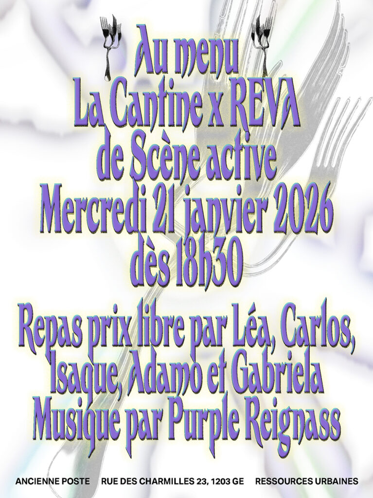 La Cantine s’associe à l’association Scène active et son programme REVA pour le premier repas de l’année à l’Ancienne Poste! Léa, Carlos, Isaque, Adamo et Gabriela seront en cuisine et Purple Reignass aux platines. On se réjouit de vous accueillir!