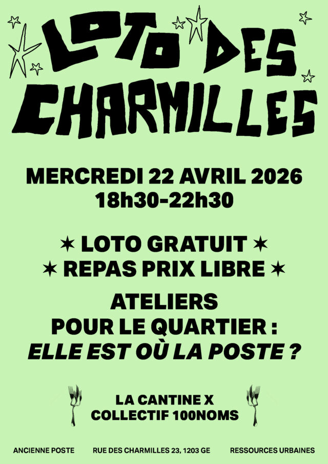 MERCREDI 22 AVRIL 2026 DÈS 18H30★★ LOTO DES CHARMILLES ★★Ancienne Poste (rue des Charmilles 23, 1203 Genève) ✭ Loto ✭ Repas à prix libre ✭ Ateliers participatifs pour le quartier autour du thème...