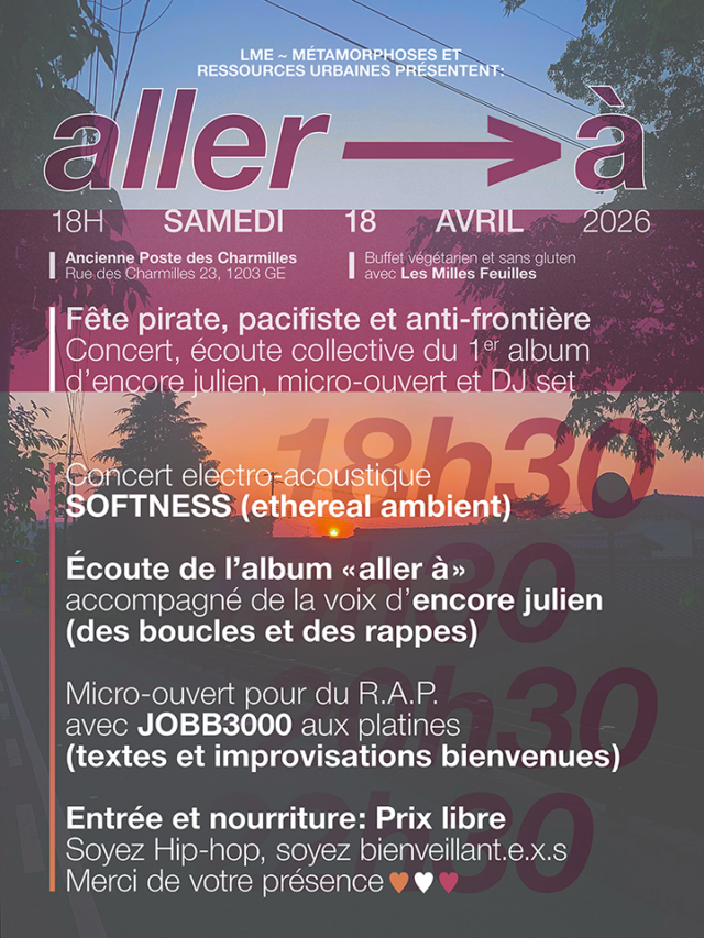 SAMEDI 18 AVRIL DÈS 18HAncienne Poste des Charmilles (rue des Charmilles 23)Rendez-vous samedi 18 avril en musique pour vernir l’album de RAP abstrait « aller à » d’Encore Julien.Une célébration...