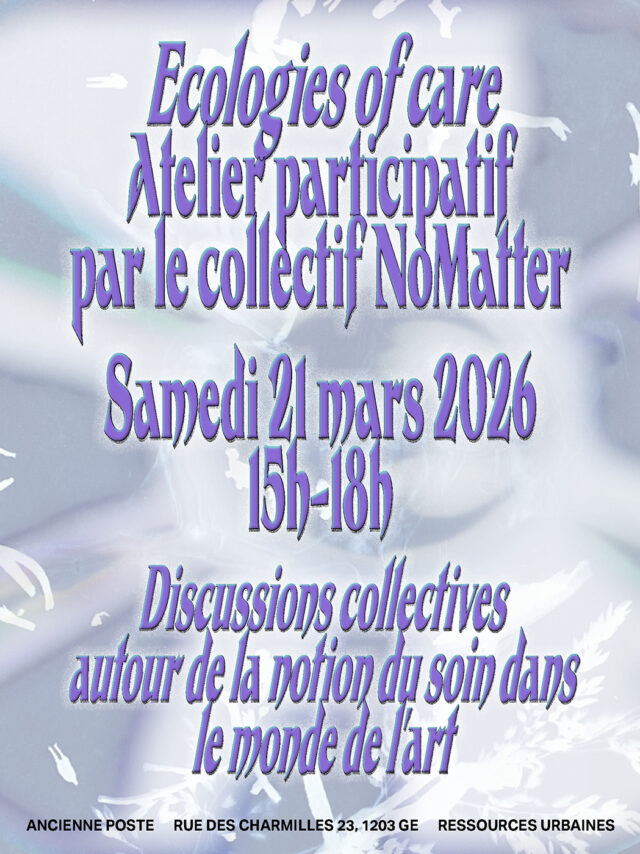 ❥ Atelier participatif «Ecologies of care» ❥SAMEDI 21 MARS 2026 15H00-18H00 Ancienne Poste des CharmillesRue des Charmilles 23, 1203 Genève Le samedi 21 mars dès 15h, le collectif NoMatter nous...